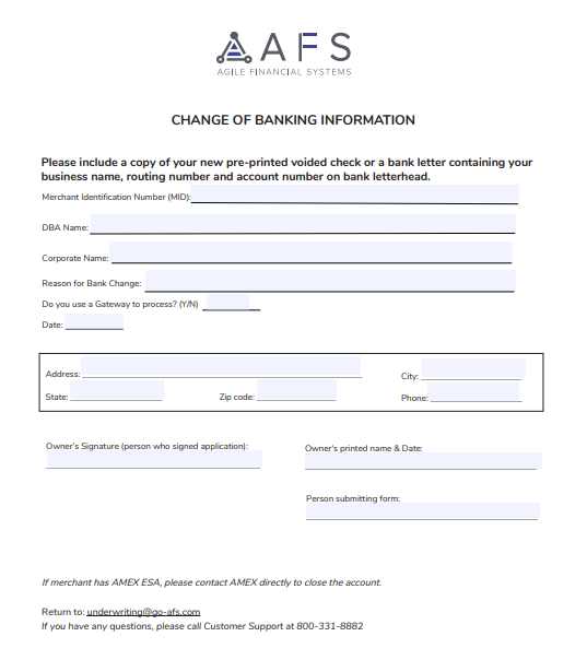 Have client fill up the Change of Banking Information form and ask for voided check. Send to support@go-afs.com. Turnaround time: 24-48 hours.