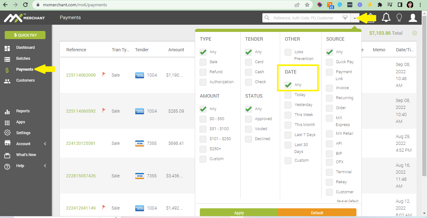 - On the left hand side, go to Payments tab and make sure to change the Date to Any so you'd be able to see all the transactions made on the account. Hit Apply.