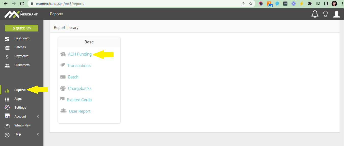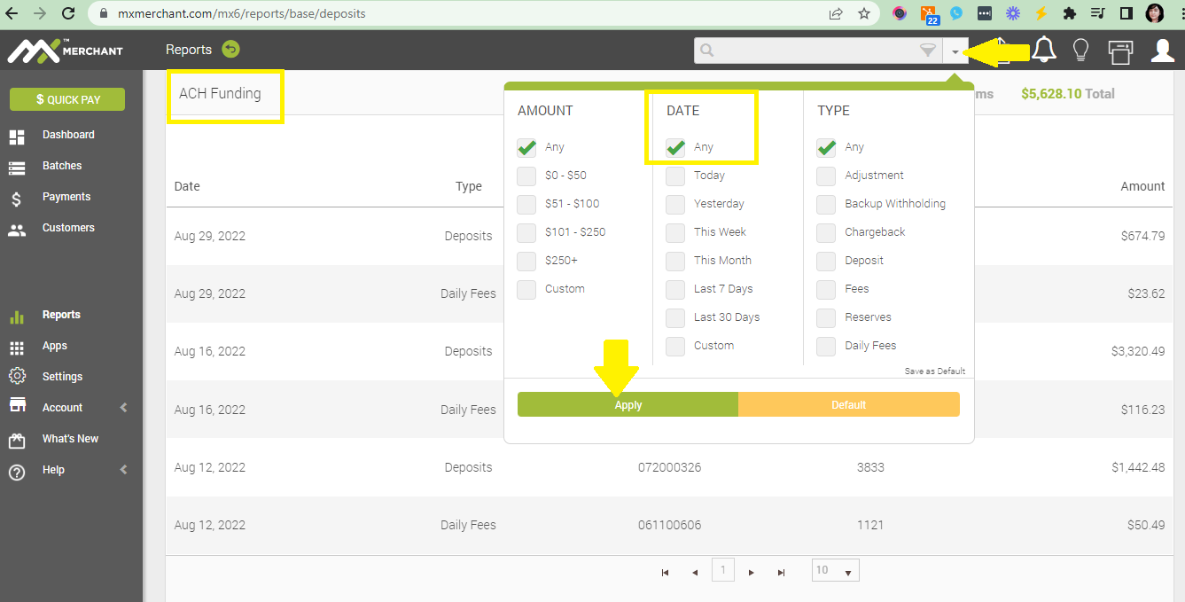 - At the same time, make sure to open a new tab for ACH Funding that's under Reports. This way, you'd be able to cross-reference the transaction dates, transaction amount, deposit amounts and the date they were deposited to the merchant's account.